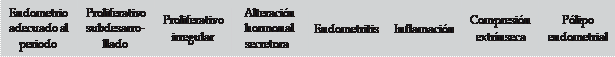 Las muestras fueron procesadas con técnica habitual y las preparaciones histológicas coloreadas con Hematoxilina y Eosina. Se catalogaron las características de las glándulas, del epitelio glandular y el superficial, de los vasos, de las células estromales y de la presencia de células inflamatorias, incluyendo su conformación y la ubicación en la mucosa endometrial. También se analizaron otras patologías endometriales.