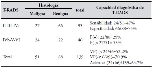 Material y métodos: se incluyeron 139 nódulos que requirieron cirugía, previamente evaluados con ecografía y con PAAF. Fueron realizadas por un mismo operador las ecografías (SMB), las punciones (OBM) y las cirugías (JLN). Se homogeneizaron las definiciones: T-RADS II-III-IVa y Bethesda II-III: Baja sospecha de malignidad; T-RADS IVb-V-VI y Bethesda IV-V-VI: Alta sospecha de malignidad.