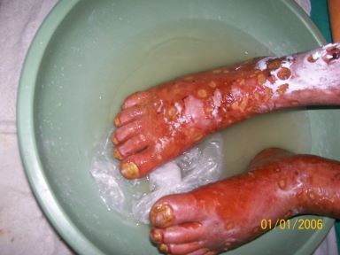 Cuando nosotros tomamos contacto con el paciente por pedido de su familia, el mismo llevaba casi 2 años en este estado. Evidenciaba un cuadro depresivo importante debido a esta situación, su estado nutricional era muy malo (Evaluación Global Subjetiva: C) y tenía múltiples úlceras en miembros inferiores con sobre infección micótica de las mismas (cándida albicans), debidas a inmersión permanente de ambos miembros inferiores en agua.(Figs. 1 -2)