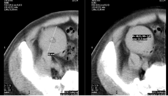 cambios densitométricos. En sentido céfalocaudal, alcanzaba el polo renal inferior y la vejiga,