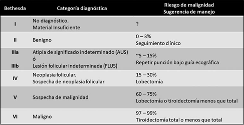 Figura 2. Clasificación citológica de sistema Bethesda.Adaptación de Figura 1 de: Baloch ZW, Alexander EK, Gharib H, Raab SS. Chapter 1. In: Ali SZ, Cibas ES, eds. The Bethesda System for Reporting Thyroid Cytopathology. New York, NY: Springer;2010:1–4.