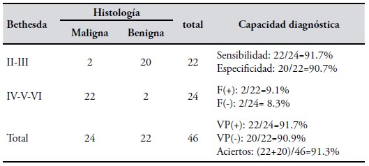 Tabla III. Evaluación de la capacidad diagnóstica de la clasificación Bethesda.